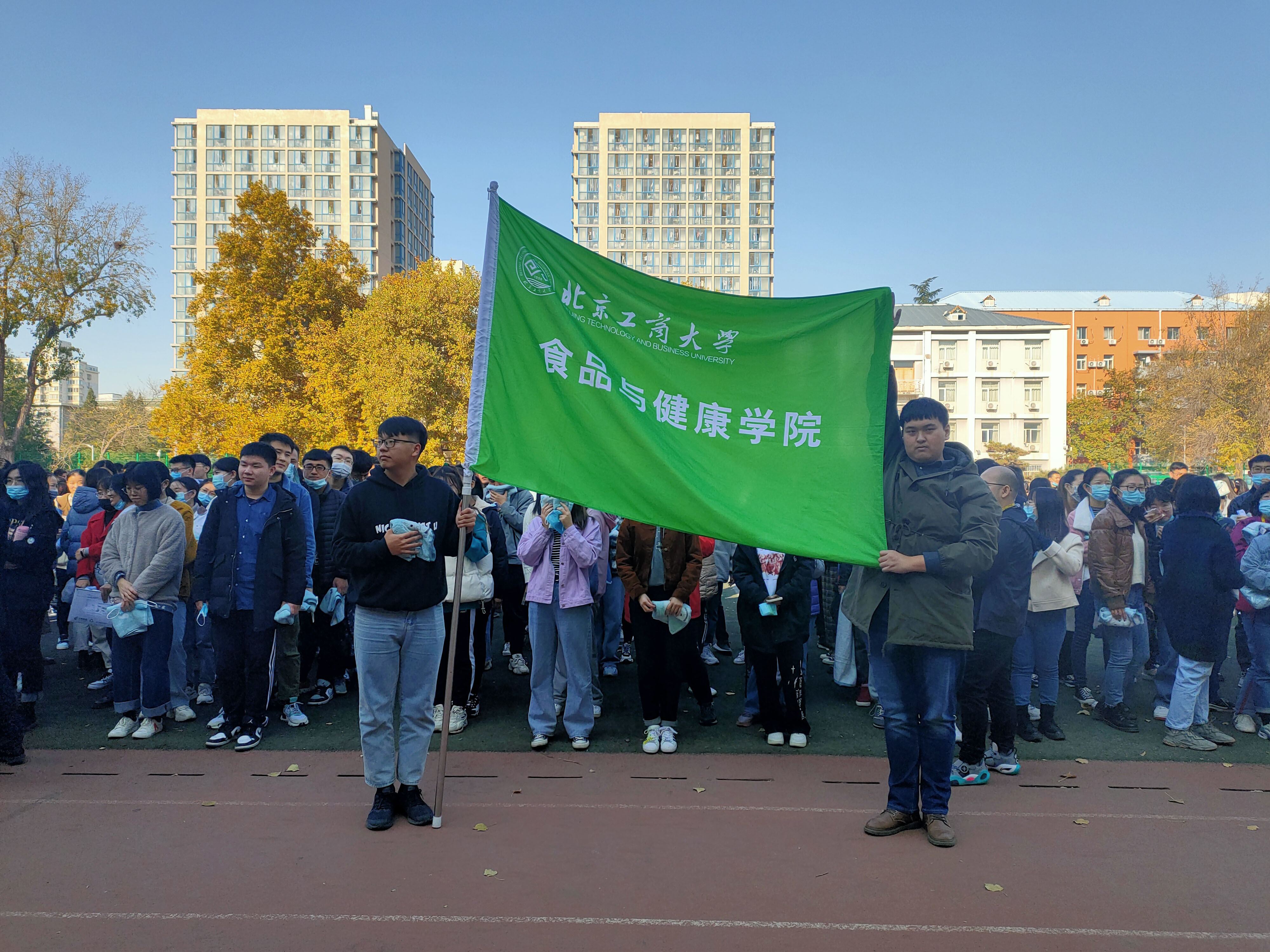 12时50分演习总指挥食品与健康公司党委书记胡燕霞宣布演习正式开始。随着中控室“起火”警报拉响,各实验室内的师生迅速进入紧急疏散状态,在疏散指示灯的指示和各楼层疏散人员的引导下,被困“火场”的师生们用叠好的毛巾捂住口鼻,弯腰快行、按照逃生方案路线,迅速而有序的从不同楼层撤离到东区操场。在撤离过程中,没有出现拥挤、踩踏等安全事故,并主动避让上楼救援的消防及救护人员。人员到达集合地点后,快速整队并核查人数,整个应急演习活动规范、有序、紧凑、安全、高效。