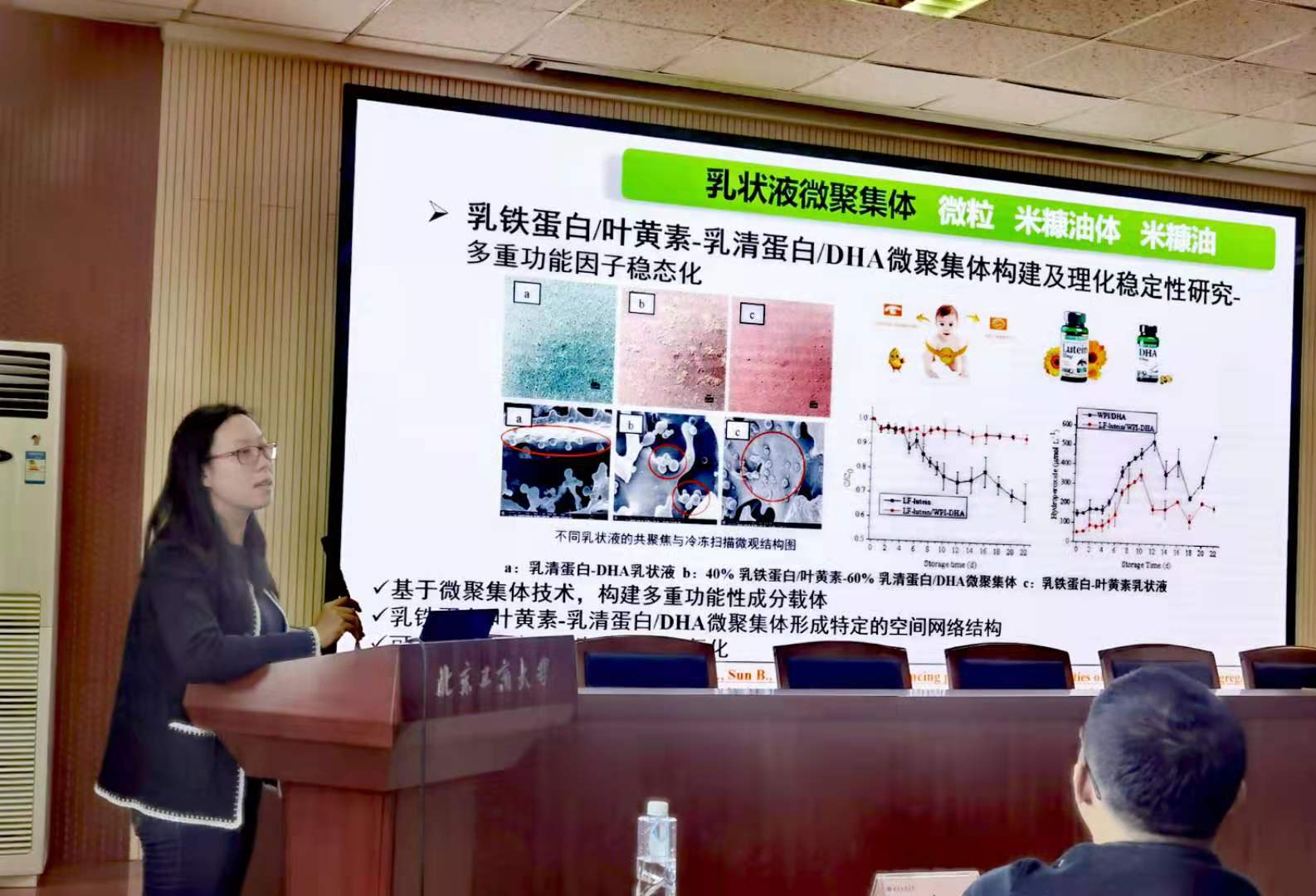 许朵霞以“蛋白质基递送载体研究”为题,对蛋白质基递送载体乳状液微聚集体、微粒、米糠油体展开介绍,实现了功能因子稳态化、脂肪替代等作用。
