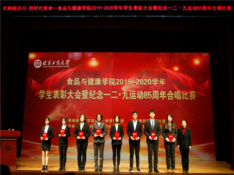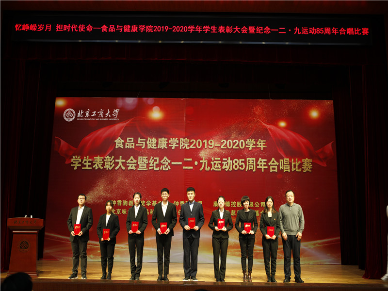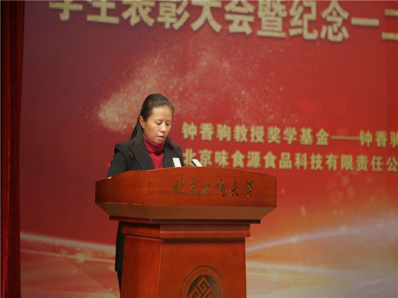 员工处处长吕良宣读了表彰决定。本次表彰大会共表彰先进集体41 个,优秀、先进个人147人次,奖学金298人次。其中,6人获国家奖学金;1人获董事长奖学金;11人获国家励志奖学金;18人次在各类市级及以上学科竞赛中取得优异成绩;33人次获“钟香驹教授奖学基金”、“味食源奖学金”、“康师傅奖学金”等社会奖学金。