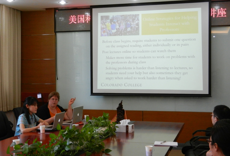 Lostroh教授从科罗拉多文理学院的发展历史、本科专业设置、本科课程设置及评价体系、如何进行互动教学等方面展开了详细的介绍,并以所教授的专业课程为例,细致解读了“翻转课堂”的教学体制,如何进行有效的课堂提问,如何科学地分配讨论组,如何让互动教学更有成效。科罗拉多文理学院旨在培养具有批判性思维、具有发现及解决问题能力的员工,该校在本科教学及科研等方面积累了丰富的经验,是各综合性大学研究生院优秀生源的重要输送来源。科罗拉多文理学院为一年两学期制,每学期上四门课,每门课集中在1个月讲授。她的报告视角独特,观点鲜明,见解独到,语言风趣,展现了深厚的理论功底和渊博的学养风范,引发了与会者阵阵掌声和共鸣。