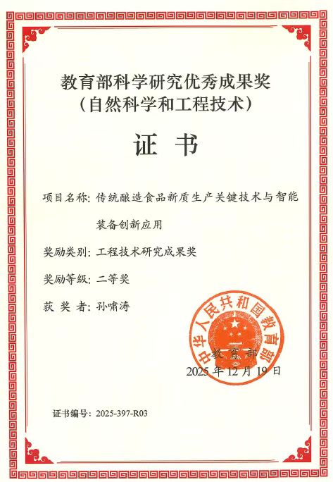 近日,2025年度教育部科学研究优秀成果奖(自然科学和工程技术)获奖名单公布。公司副研究员孙啸涛作为第3完成人、学校作为第2完成单位参与完成的“传统酿造食品新质生产关键技术与智能装备创新应用”项目,荣获工程技术研究成果奖二等奖。